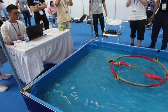 水面垃圾清理赛项是我校第二次参加,比赛是在自然开放水域中进行,由我校创新团队(队员:姜喜强、于文录、罗友涵、周迪,指导老师:查富生)自主研发、制作的清理船,以1分06秒清理10个目标物的成绩获得冠军,成功卫冕。全局视觉抢球博弈比赛中,飞凫队(队员:厚俊臣、张珈瑞、陈炜、李佩禹,指导老师:林森,潘旭东),经过一天的激战,最终获得亚军。海参捕捞模拟赛是我校首次参加的赛项,惊鸿游龙队(队员:荣健睿、张铭伟、岳宗言、徐森涵,指导老师:刘佳男,曾昭阳)经过现场设备调试、方案验证,最终获得季军。