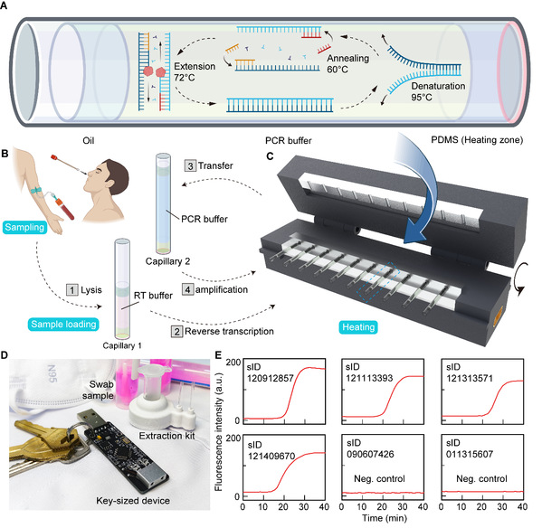 针对上述问题,团队提出基于瑞利-贝纳德对流的水平核酸扩增新机制,实现毛细管单端加热时,溶液受热上升、遇冷下沉,形成稳定对流循环,使核酸分子在密闭空间内自主穿越变性、退火、延伸三温区。同步开发的“毛细自装载”技术利用液固界面张力,仅需4.5秒即可完成13微升(μL)样本吸入与双端密封,彻底消除气泡干扰。配合振动隔离装置,系统在车载颠簸及30°倾斜环境下仍可稳定运行。基于该技术的终端便携式检测设备,可集成于U盘实现超便携检测目标。通过130例临床试验(包括乙肝、新冠、甲流),准确率为96%,特异性为100%,检测限低至10拷贝数每微升。